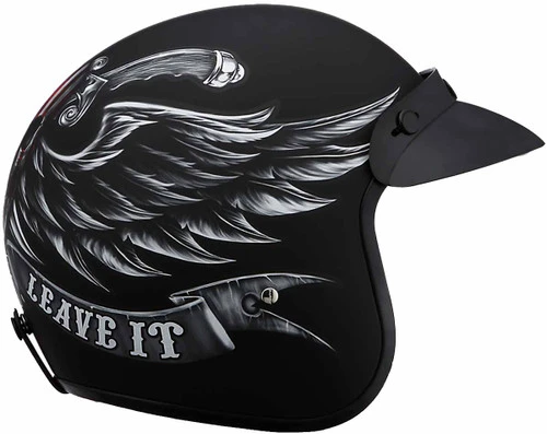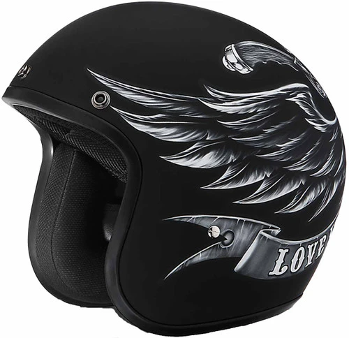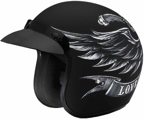 The D.O.T. Daytona Cruiser 3/4 Shell Helmet In The Love It Graphic, Meets And Exceeds D.O.T. FMVSS 218 Standards And Is The Smallest D.O.T. 3/4 Shell Helmet Ever Made!! With 3 Different Shell Sizes, You’re Sure To Get That Proportionate Fit!! Available Only With Removable, Snap On Gloss Black Bubble Visor. Many More Colors And Designs Available Such As Soft Touch Dull Black, Hi-Gloss Black And White; Custom Colors: Gun Metal Grey Metallic; Specialty Items: Metal Flake. Free Head Wrap And Cloth Draw String Bag Included. Sizes Range From XS-2XL.