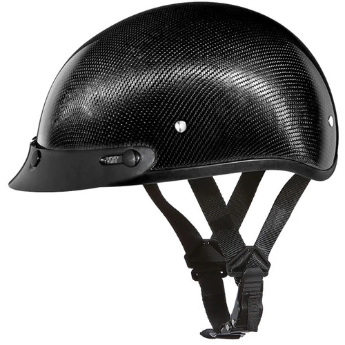 The Daytona Skull Cap Half Helmet with Visor Carbon Fiber is one of the smallest D.O.T. half-shell helmet ever made. Daytona Helmets used the latest carbon fiber weaving techniques to create a stronger and lighter helmet. DOT Approved helmets require at least a 1 inch liner. Many DOT Approved half helmets range between 1-2″ thick. The thickness is commonly measured at the thinnest area, which is the ear area. Depending on the size, the Daytona Skull Cap stays closer to 1 – 1 1/4″. The slim, contoured design lets the helmet hug your head and the sweat wicking fabric helps keep you comfortable. The Adjustable Y strap will allow you to move the strap where you want it. No D-rings to mess with, since the Daytona Skull Cap comes with a handy ratchet quick release for fast on and off. With 3 outer shell sizes and 10 sizes available, you’ll be sure to get the snug fit you need!