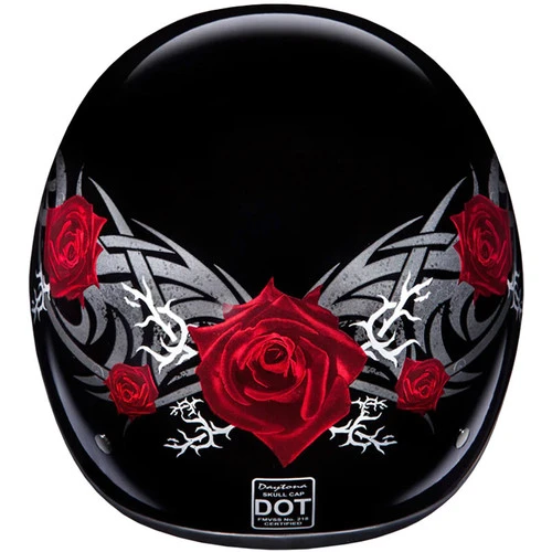 Daytona Slim Line Skull Cap 1/2 Shell Helmet in Rose Graphic. Meets and Exceeds D.O.T. FMVSS 218 standards and is one of the smallest D.O.T. 1/2 Shells in the market! With 3 different shell sizes, you’re sure to get that proporitionate fit! Custom formed interior for X-treme comfort. DOT Approved helmets require at least a 1 inch liner. Many DOT Approved half helmets are between 1-2″ thick. The thickness is commonly measured at the thinnest area, which is the ear area. Depending on the size, the Daytona Skull Cap stays closer to the minimum at 1 – 1 1/4″.