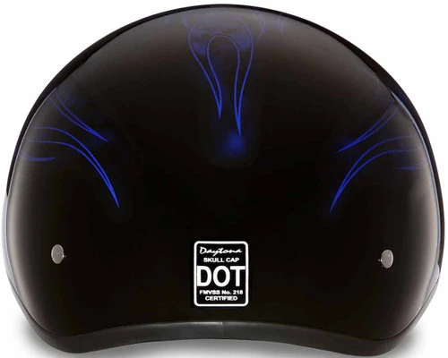 Daytona Slim Line Skull Cap 1/2 Shell Helmet in Flames Blue Graphic. Meets and Exceeds D.O.T. FMVSS 218 standards and is one of the smallest D.O.T. 1/2 Shells in the market! With 3 different shell sizes, you’re sure to get that proporitionate fit! Custom formed interior for X-treme comfort. DOT Approved helmets require at least a 1 inch liner. Many DOT Approved half helmets are between 1-2″ thick. The thickness is commonly measured at the thinnest area, which is the ear area. Depending on the size, the Daytona Skull Cap stays closer to the minimum at 1 – 1 1/4″.