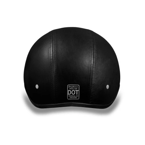 Daytona Slim Line Skull Cap 1/2 Shell Helmet in Leather. Meets and Exceeds D.O.T. FMVSS 218 standards and is one of the smallest D.O.T. 1/2 Shells in the market! With 3 different shell sizes, you’re sure to get that proporitionate fit! Custom formed interior for X-treme comfort. DOT Approved helmets require at least a 1 inch liner. Many DOT Approved half helmets are between 1-2″ thick. The thickness is commonly measured at the thinnest area, which is the ear area. Depending on the size, the Daytona Skull Cap stays closer to the minimum at 1 – 1 1/4″.