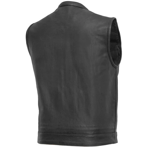 Are you looking for a clean, classic club style vest? The Sharp Shooter is just the right choice for you. Sharp Shooter is made with Drum Dye Naked Cowhide. The Drum-dyeing process ensures that the dye penetrates deeply into the leather, resulting in a more colorfast and fade-resistant finish. It enhances the overall durability of the vest, making it more resistant to wear and tear. The thickness and quality of this leather provides a strong layer of protection against impacts, road rash, and other potential injuries. Moreover, it molds to the body over time, offering a snug fit and excellent flexibility, allowing for ease of movement while riding. It has a banded collar, covered snaps and covered, cropped center zipper. It’s got a mesh lining, with easy access panels for adding patches and embroideries.